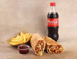 Склад: Лаваш-піта, салат айсберг, помідор, маринований огірок, м'ясо на вибір, фірмовий часниковий та томатний соус. До комбо входить картопля фрі , напій та соус