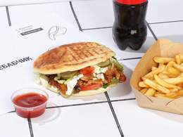 Лаваш піта, салат айсберг, маринований огірок, томати, куряче м'ясо, томатний соус та медово-гірчичнийУ комбо меню входить: Вода в асортименті на вибір, картопля фрі та соус в асортименті