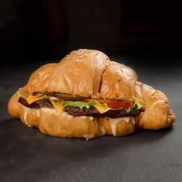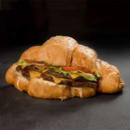 Круасан, яловича котлета, сир Тостовий, салат Айсберг, помідор, квашений огірок, цибуля сушена, соус Бургерний. Можлива заміна виду салату в зв'язку з перебоями постачання