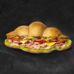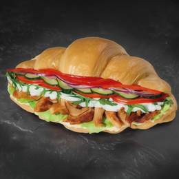 Круасан, курка, салат, огірок, імбир маринований, кунжут, соус Теріякі. Можлива заміна виду салату в зв'язку з перебоями постачання
