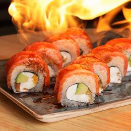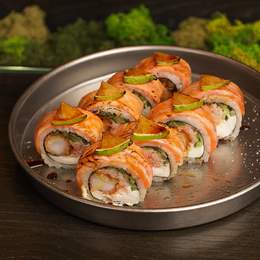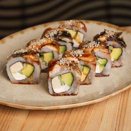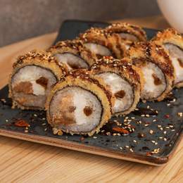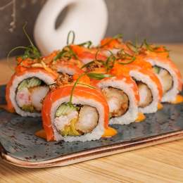 Гармонійне поєднання соковитого лосося, хрумкої креветки панко, ніжного крабового м’яса та крем-сиру. Свіжість лайма та солодкість унагі-соусу додають пікантного контрасту *Містить алергени: продукти з риби, молоковмісні продукти, соя, ракоподібні