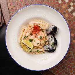 Насичений рибний бульйон з крафтовою локшиною та морепродуктами: лосось, креветка, мідія та кальмар з додаванням маринованого яйця, спецій шишимі тагараші та чіпсом норі, зеленою цибулею, перцем чилі, лимоном та сіллю кациобуші *Містить алергени: продук