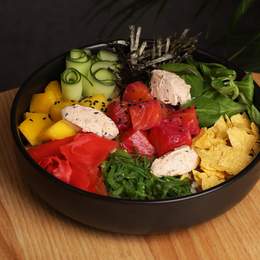 Поке з лососем гравлакс, манго, чукою, крем-сиром, ікрою корюшки, кунжутом, горіхом кеш'ю та огірком. Доповнюється маринованим імбирем, перцем чилі, кунжутом, чіпсами начос, салатом маш та кунжутним соусом. Основа - салатний мікс, рис, кіноа, рис + кіноа