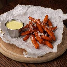 Хрусткі стіки батату, багато пармезану + соус Айолі. *Містить алергени: молоковмісні продукти., продукти з яєць , гірчиця.