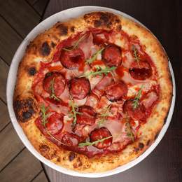 Мега мʼясна піца яка поєндює в собі 4 види мʼяса, а саме - Прошуто котто, чорізо,шинка та бекон в пікантному соусі та ширачі власного виробництва з хрумкою руколою, справжня very meat pizza + соус до бортиків. *Містить алергени: глютен, молоковмісні