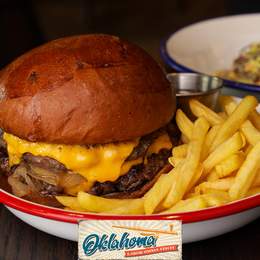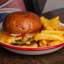 Котлета з крафтової яловичини, сир чеддер, соус айолі, солодка цибуля, салат ромен, рукола, у булці бріош. Подається з картоплею-фрі та соусом Tennesey BBQ *Містить алергени: глютен молоковмісні продукти, гірчиця,продукти з яєць