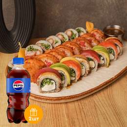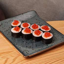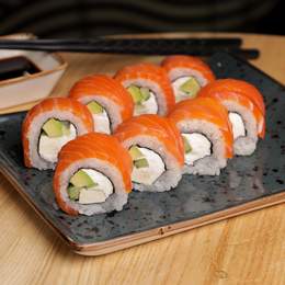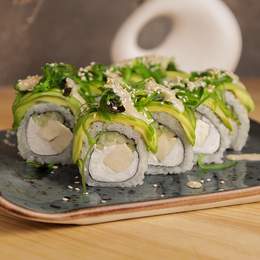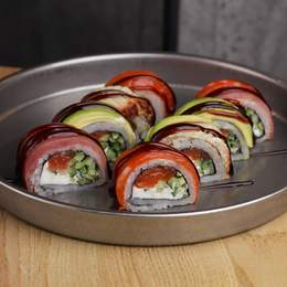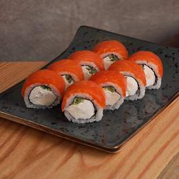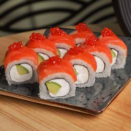 Авторський рол з подвійним лососем, крем-сиром, авокадо, норі, рисом та ікрою. *Містить алергени: молоковмісні продукти, продукти з риби.