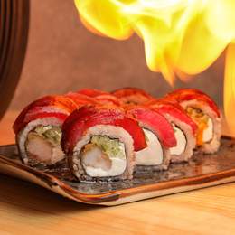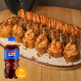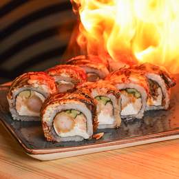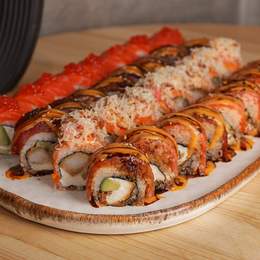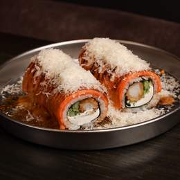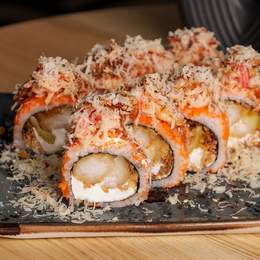 Авторський рол з креветкою темпура, рисом, норі, сніжним крабом, крем-сиром, хрусткою цибулею та ікрою корюшки. Доповнюється гострим майо, унагі, пармезаном, шишимі тагараші та трюфельною олією. *Містить алергени: Креветка, продукти з риби та ракоподіб