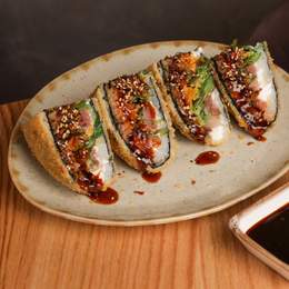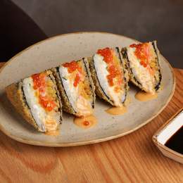 Бургер з тунцем, крем-сиром, норі, рисом, чукою, ірою корюшки. Обсмажується в сухарях панко, доповнюється хрусткою цибулею, соусом том ям, спеціями фурікаке. *Містить алергени: соя, продукти з риби, молоковмісні продукти, кунжут, порошок яєчний.