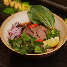 В'єтнамський суп на основі бульйону фо з рисовою локшиною, яловичиною, кінзою, чилі, синьою та зеленою цибулями, лаймом, капустою пакчой, соєвими паростками, маринованою морквою, лаймом та соусом ширачі. *Містить алергени: селера, продукти з риби, соя