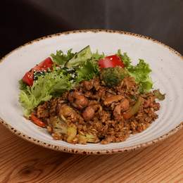 Смажений рис з куркою, овочами, цибулею та грибами шиїтаке в пікантному соусі ВОК чилі. Готується на відкритому вогні в WOK. Подається з салатним міксом та кунжутом. *Містить алергени: соя, кунжут.