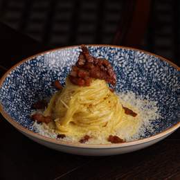 Паста власного виробництва з панчетою в оригінальному соусі з жовтків та пармезану. *Містить алергени: молоковмісні продукти, продукти з яєць, глютен