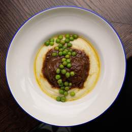 Соковиті яловичі щоки томлені у пиві та овочах з картопляним пюре та зеленим горошком. *Містить алергени: селера, молоковмісні продукти.