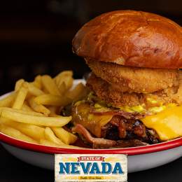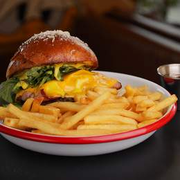 Мегаситний бургер! Дві яловичі котлети, сир чеддер, американська гірчиця та цибуля. Подається з салатом коул слоу та картоплею фрі. *Містить алергени: глютен , молоко вмісні продукти, гірчиця, продукти з яєць