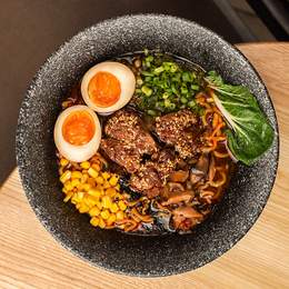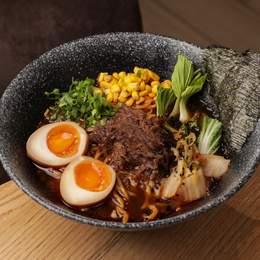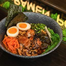 Насичений бульйон з соусом нігоші, куркою теріякі та крафтовою локшиною. Подається з маринованим яйцем, морквою, зеленою цибулею, норі та водоростями комбу, капустою пакчой та грибами шиїтаке. Посипається насінням кунжуту. *Містить алергени: продукти з я