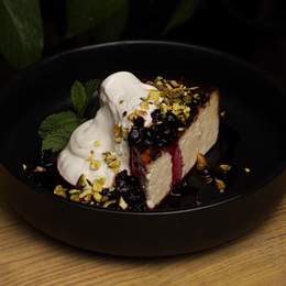 Ніжний чізкейк, подається з грецьким йогуртом, фісташкою та конфітюром. *Містить алергени: молоковмісні продукти, яєчний продукт, горіхи