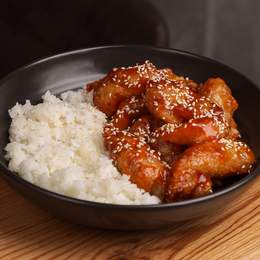 Курка в хрусткому клярі та кисло-солодкому соусі посипана білим кунжутом, подається з рисом. *Містить алергени: соя, кунжут.