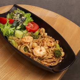 Крафтова локшина удон з тигровими креветками, овочами та грибами, готується на відкритому вогні в WOK. Подається з горіховим соусом та салатним міксом, кунжутом і цибулею. *Містить алергени: продукти з риби, молюсків, глютен, соя.