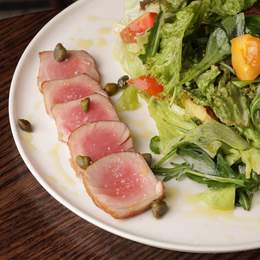 Емілі-мікс, тунець-татакі, печена картопля, авокадо, томати під дрессінгом з оливкової олії та лимонного соку. *Містить алергени: продукти з риби