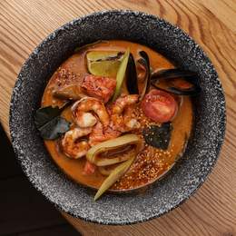 Тайський гострий суп на основі кокосового молока та пасти Том Ям, з додаванням морепродуктів: лосось, кальмар, тигрові креветки, та мідії, з додаванням грибів, чері та кінзи. Подається з рисом. *Містить алергени: продукти з риби, молюсків, глютен, соя,