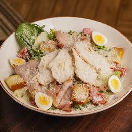 Emily-мікс з куркою в панко, чері, шинкою, перепелиним яйцем, оригінальним соусом Цезар та білими грінками від Emily, пармезаном. *Містить алергени: глютен, продукти з риби, молоковмісні продукти., продукти з яєць