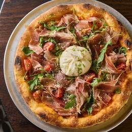 Дуже багато прошуто та буррата власного виробництва зі свіжою руколою та чері на томатному соусі з моцарелою + соус до бортів. "*Містить алергени: глютен , молоковмісні продукти, кешью. "