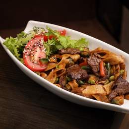 Крафтова локшина удон з яловичиною та овочами в пікантному соусі блек пеппер та цибулею. Готується на відкритому вогні в WOK. Подається з салатним міксом та кунжутом. *Містить алергени: борошно пшеничне, соя, кунжут, арахіс