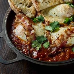 Ароматна шакшука з печі: багато овочевої сальси, чіпси з бекону, яйця, з зеленню та домашнім хлібом від Emily. *Містить алергени: глютен, молоковмісні продукти, яйця, молоковмісні продукти.