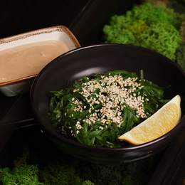 Водорості чука з горіховим соусом, лимоном та кунжут. *Містить алергени: кунжут, горіх кеш’ю, соя.