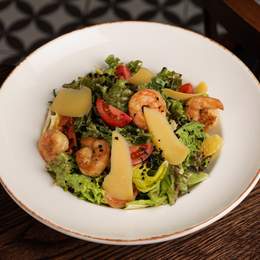 Великі креветки мариновані в устричному соусі, томати чері, Emily-мікс у медово-гірчичному соусі з великими шматками філе апельсину, оливковою землею та слайси з сиру старий Амстердам. *Містить алергени: молоковмісні продукти, ракоподібні, гірчиця