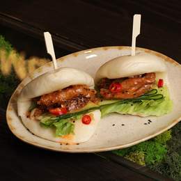 Традиційні китайські парові булочки з куркою та соусом топінг пад тай, перцем чилі, огірком та салатом айсберг з японським майонезом та ікрою корюшки. Посипані кунжутом. *Містить алергени:, глютен, молоковмісні продукти, продукти з риби, гірчиця, кунжу