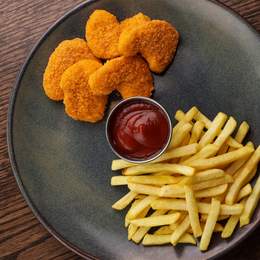 Соковиті курячі нагетси, хрумка картопля фрі та ніжний дитячий кетчуп. *Містить алергени:, глютен, може містити незначні сліди гірчиці