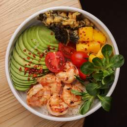Поке з креветкою, манго, помідорами чері, авокадо, смаженими чіпсами норі, салатом маш. Поливається грибним соусом із трюфельною пастою із додаванням вершкового масла, часнику, кім-чі-майо та солодкої паприки. Основа - салатний мікс, рис, кіноа, рис +