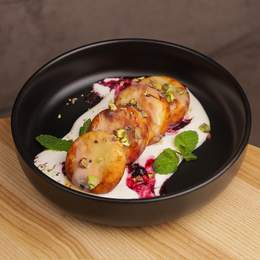 Ніжні сирнички з сезонними ягодами, крем сирним соусом та подрібненою фісташкою, молочно гріховим соусом *Містить алергени: молоковмісний продукт, яєчний продукт, горіхи