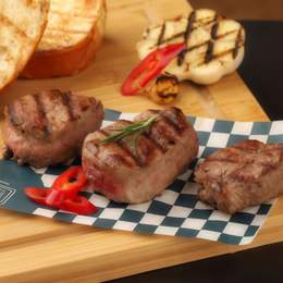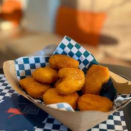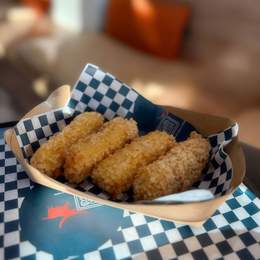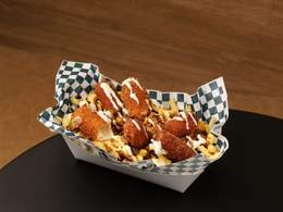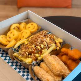 Нагітси курячі, моцарела фрі, картопляні смайлики або картопляні кульки , картопля фрі з соусом BBQ, сирний соус та хрустка цибуля.