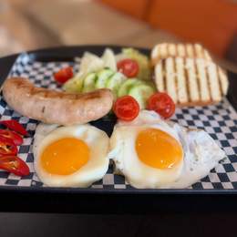 Мисливські ковбаски, яєшня, картопля фрі, свіжі огірочки та помідори, грінки.
