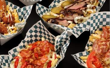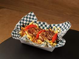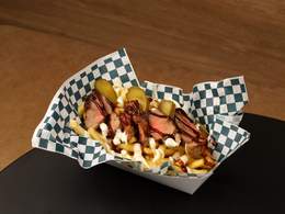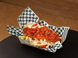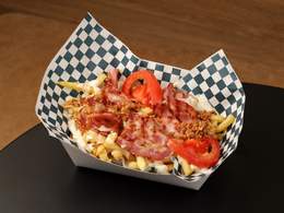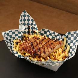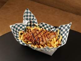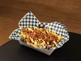 - Картопля фрі з соусом BBQ, сирним соусом та хрусткою цибулею-280 г