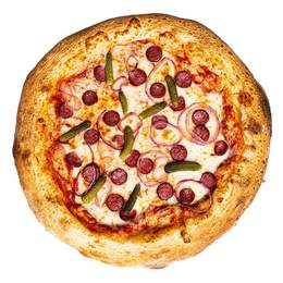 томатний соус, моцарела, баварські ковбаски, корнішон, синя цибуля (Страви готуються за фіксованими рецептурами - побажання щодо складу не виконуються)