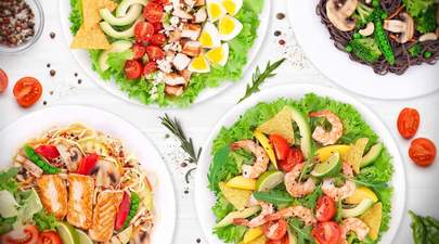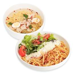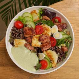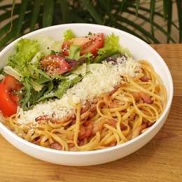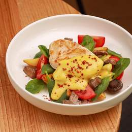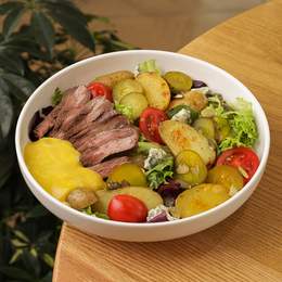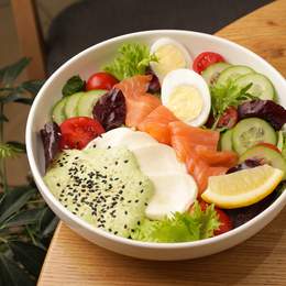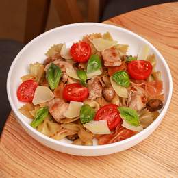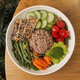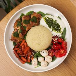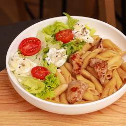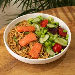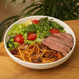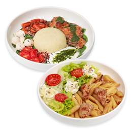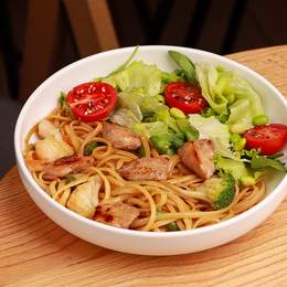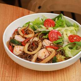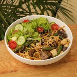 Лінгвіні, мідії, креветки, кальмари, броколі, квасоля спаржева, цвітна капуста, салат мікс, чері, зелений горошок, кунжут, соус Вок, соус кисло-солодкий *Містить алергени: борошно пшеничне, мідії, креветки, кальмари, насіння кунжуту, кунжут, соя, молюски
