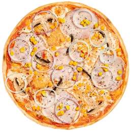Шинка, печериці, кукурудза, цибуля Кримська, сир Моцарела, соус, сухі спеції
