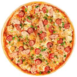 Шинка, помідори, печериці, цибуля Кримська, сир Моцарела, спеції, соус