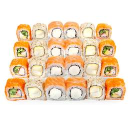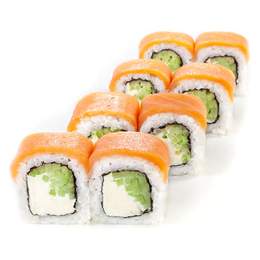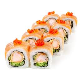 Рис, норі, креветка темпура, соус Табаско, огірок, свіжий лосось, ікра лосося
