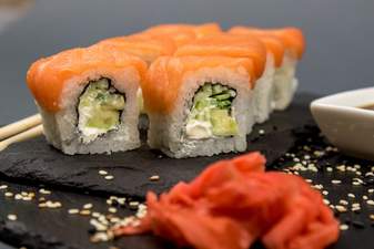 Рис, норі, крем сир, огірок, копчений лосось