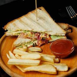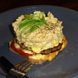 Скрембл, котлета з індички, сир, помідор, тост, зелена цибуля, барбекю та сирний соус