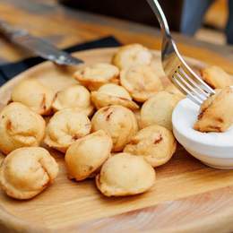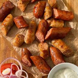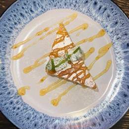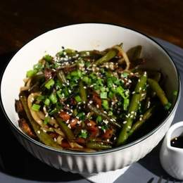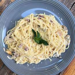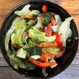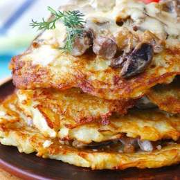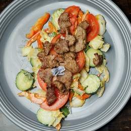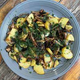Пательня зі свининою в соусі з червоного вина та соєвого соусу, з грибами, картоплею, помідором, болгарським перцем, цибулею й часником. Посипається пармезаном і свіжою зеленню