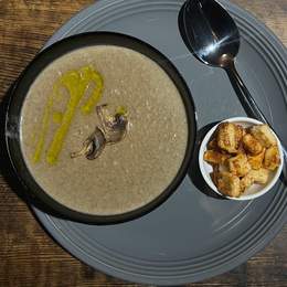 Грибний крем-суп з шампіньйонів, цибулі, картоплі та соєвого соусу. Подається з хрусткими сухариками.