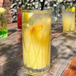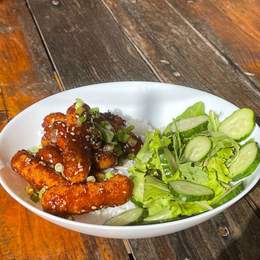 Соковитий бургер з куркою, сиром, помідором, солоним огірком, маринованою червоною цибулею та хрустким айсбергом. Подається з картоплею фрі