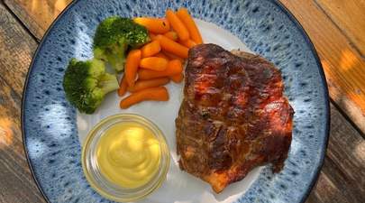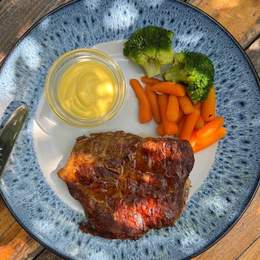 Стейк зі свинячого ошийка , подається з броколі та морквою