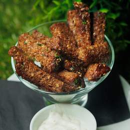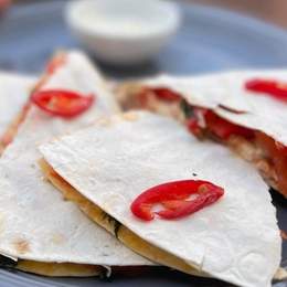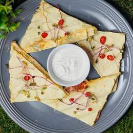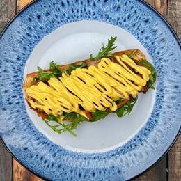 Брускета з телятиною, запеченим болгарським перцем, міксом салату, гірчичним і сирним соусами