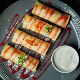 Два млинці з бананом і згущеним молоком, два — з вишнею та маком. Подаємо зі сметанкою
